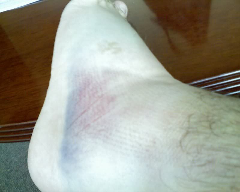Next up, is kind-of gross. My ankel got totally pwned on Wednesday. I hike Kennesaw Mountain Trail on my lunch breaks during the week and coming down, about a third f the way, I was jogging and landed on a rock the wrong way. Ankle rolled, I writhed in pain and had to hobble about a 3/4 of a mile the rest of the way down. This is probably the 7th or 8th time I've rolled this ankle and I think it hurts worse after each one. I went out and replaced my dog-eaten Aircast with a new one. All I have to say is "Look at all the pretty colors."
