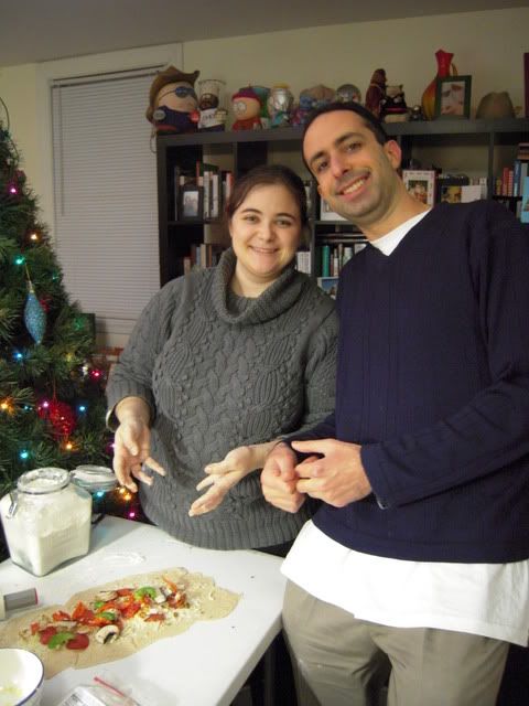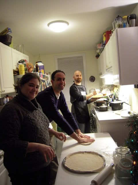 Soon enough, we had the assembly line in action, with me on sauce and chicken duty, Matt and Amy on dough and Michelle, er WHERE was Michelle anyway?