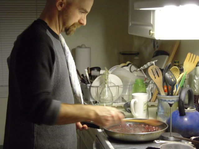 Instead of taking on the weather and the numerous intoxicated idiots who would no doubt be on the street, we decided to have a little low-key "Pizza & Movie" night at our place. So I began to make some sauce from scratch and get the house set up. The Welcoming Committee sat in waiting for the guests to arrive.