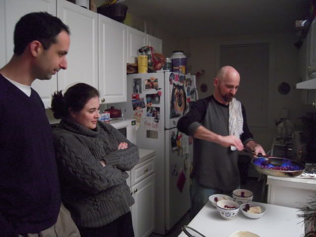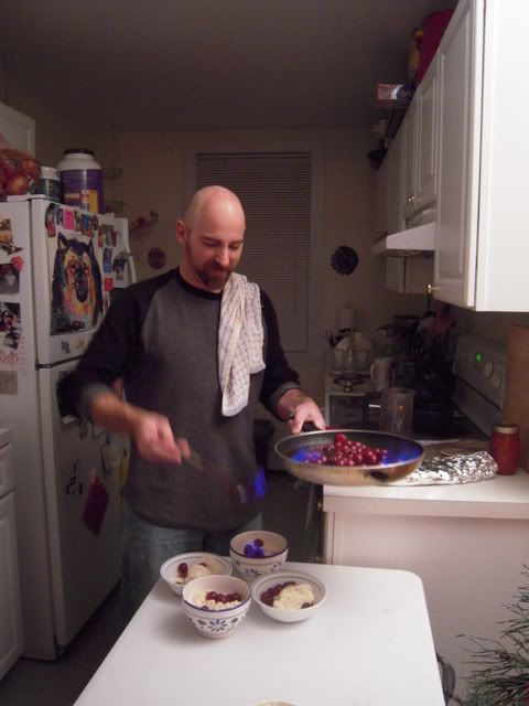 Once some (but not all of course) of the alcohol has burned off, you pour the flaming mixture over vanilla ice cream. Both Matt and Amy were dubious about this second stage.